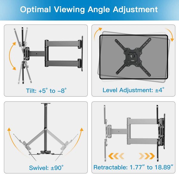 Our articulating TV wall mount bracket allows +5° and -8° tilt to reduce glare, 90° swivel to optimize viewing angles and 1.77" to 18.89" arm extension for flexible movement and adjustment.